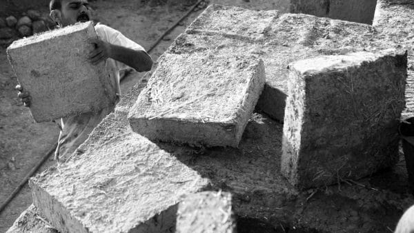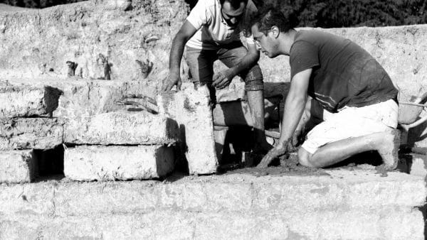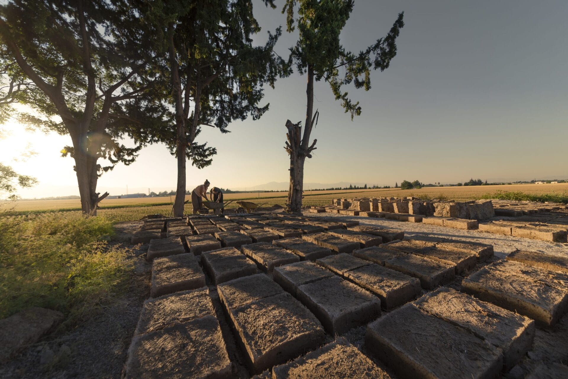 Onur Hasan Kırman and Hikmet Eslikızı laying a course of mud bricks