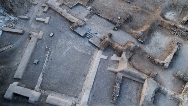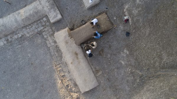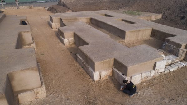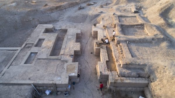 Aerial view of the tripartite gate complex, mud brick capping in progress