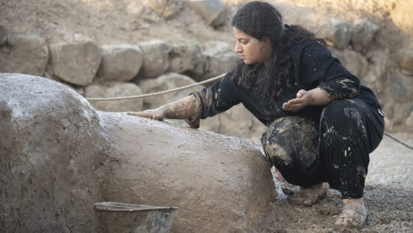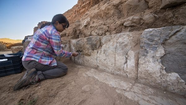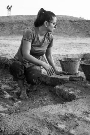 Büşra Hekimoğlu is mud plastering the courtyard walls of the Late Bronze Age palace