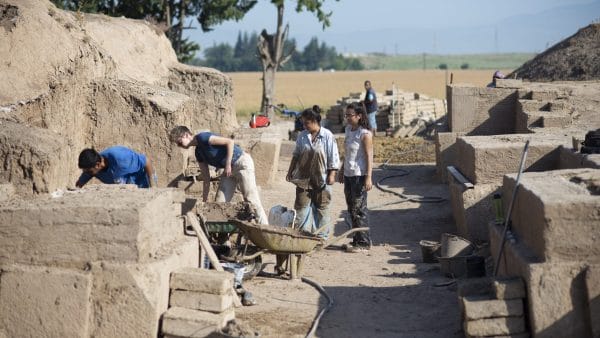 Baran Kerim Ecer, Hélène Maloigne, Büşra Hekimoğlu and Defne Bilgili working at the tripartite gate